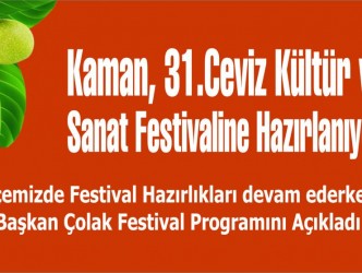 8-9 Ekim 2022 tarihlerinde yapılacak 31.Kaman Ceviz Kültür ve Sanat Festivali hazırları devam ederken Kaman Belediye Başkanı Necati Çolak bir basın açıklaması yaparak Festival Programını açıkladı. Başkan Çolak açıklamasında; 8-9 Ekim 2022 tarihlerinde gerçekleştirilecek Ceviz festivalinin 2 gün boyunca devam edeceğini hatırlatarak; “Pandemi süreci bizleri çok yordu, çok üzdü. İlçe halkının uzun bir aradan sonra eğlenmeye ihtiyacı var. Çeşitli etkinliklerle vatandaşlarımızın yeniden eski günlerine dönmelerini arzuluyoruz. İlçe ekonomisine katkı sağlayacak festivalimiz ile kaman cevizimizin ve ilçemizin tanıtımını yaparak ulusal ve uluslar arası alanda cevizimizin hak ettiği değere ulaşmasını sağlayacağız.” Dedi.